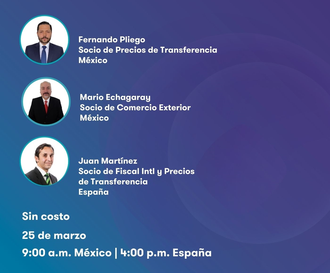En este webinar, expertos de nuestra firma en España y México analizarán el impacto de estos aranceles y otros aspectos fiscales internacionales en las empresas españolas y en muchos casos europeas. Los Precios de transferencia y una adecuada imputación de beneficios serán claves en dicha estrategia o planeamiento de política fiscal. También exploraremos los riesgos y oportunidades que este panorama presenta y compartiremos recomendaciones clave para mitigar sus efectos.
