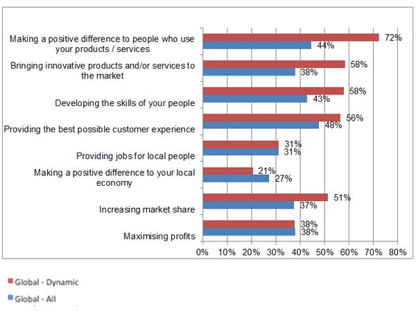 De acuerdo con resultados recientes del International Business Report de Grant Thornton, el 70.5% de las empresas dinámicas o con rápidos porcentajes de crecimiento alrededor del mundo, tienen un propósito no financiero bien definido, contra el 52.2% de las empresas en general. Tener un propósito es ‘muy importante’ para el 44.1% de las empresas dinámicas, comparado con el 40% de las empresas en general.