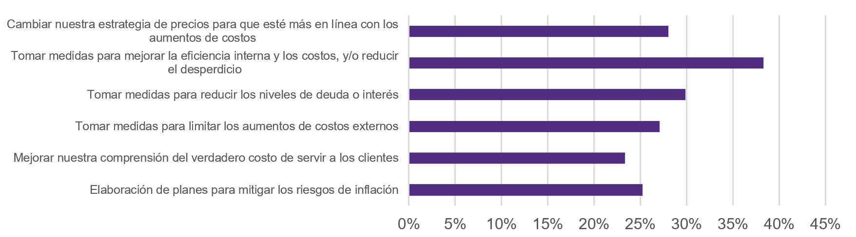 Ante los efectos de la inflación, los empresarios toman diferentes medidas para replantear su estrategia de costos. En México, la gran mayoría de los empresarios, 68%, han optado por incrementar los precios de venta al mismo ritmo que se incrementan sus costos de producción, el 17% de los empresarios planea incrementar sus precios de venta por encima del aumento en costos y solo el 15% aumentará sus precios de venta por debajo del incremento en costos.