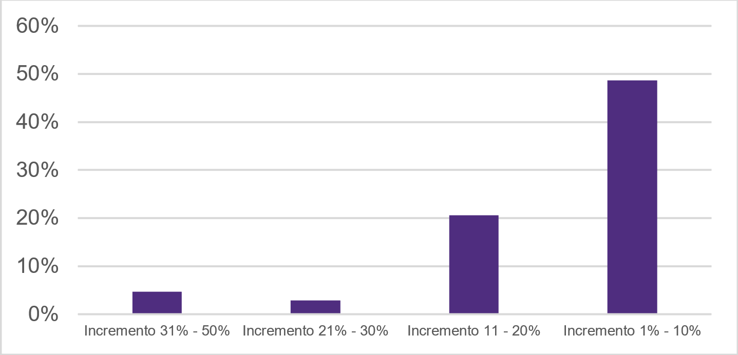 El incremento en costos ha impactado de forma diferente a las industrias y sectores de nuestro país. Los resultados de esta investigación muestran que 49% de los empresarios en México han notado incrementos generales entre 1% y 10%, el 21% mencionan que sus incrementos han sido entre 11% y 20%, mientras que para el 5% de los encuestados perciben que sus costos han incrementado entre 31% y 50%.